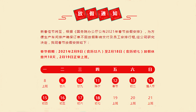 春節(jié)的腳步臨近,根據(jù)《國(guó)務(wù)院辦公廳公布2021年春節(jié)放假安排》,結(jié)合我司的具體狀況,方便生產(chǎn)車間排產(chǎn)確保訂單不因放假影響交付,經(jīng)公司研究決定,我司春節(jié)放假安排如下: